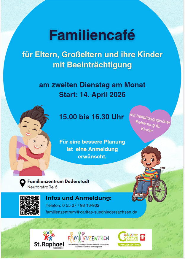 wir freuen uns sehr, ein neues Angebot für Familien vorstellen zu dürfen: Ab dem 14. April 2026 in der Zeit von 15:00- 16:30 Uhr startet im inklusiven Campus Duderstadt das Familiencafé für Eltern von Kindern mit Beeinträchtigung – in enger Zusammenarbeit mit der Tagesstätte St. Raphael.