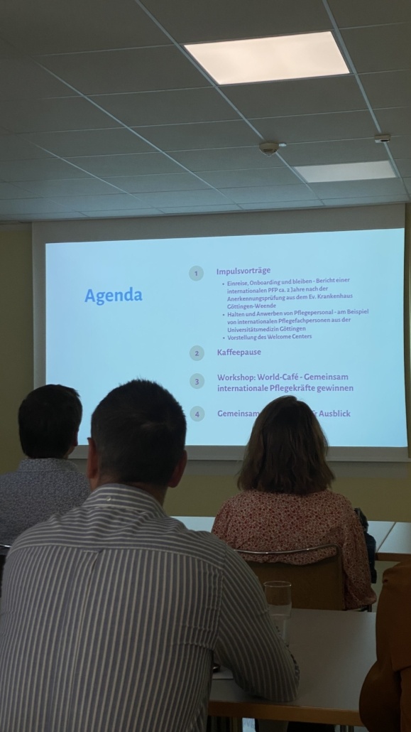 Nach einer herzlichen Begrüßung startete das Programm mit einer Reihe inspirierender Impulsvorträge. Eine internationale Pflegefachperson aus dem Evangelischen Krankenhaus Göttingen-Weende berichtete eindrücklich von ihrem Weg – von der Einreise über das Onboarding bis hin zur bestandenen Anerkennungsprüfung und den Erfahrungen in den ersten Berufsjahren in Deutschland. Ihr Erfahrungsbericht verdeutlichte sowohl die Herausforderungen als auch die Chancen, die mit dem Prozess der beruflichen Integration verbunden sind.