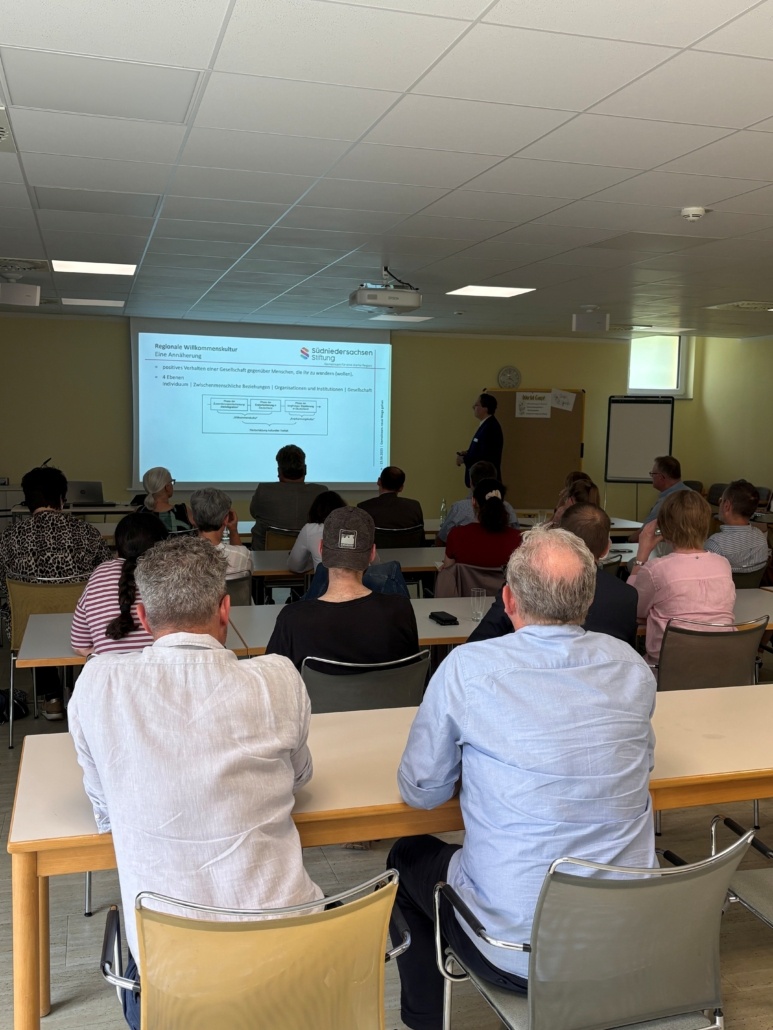Im Anschluss wurden Erfahrungen aus dem Welcome Center der Südniedersachsen Stiftung vorgestellt. Neben den Erfahrungen wurde die Bedeutung einer regionalen Willkommenskultur herausgestellt und Lösungsansätze durch Patenstrukturen und regionale Zusammenarbeit präsentiert.
