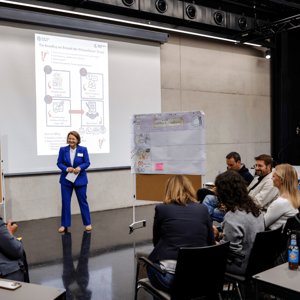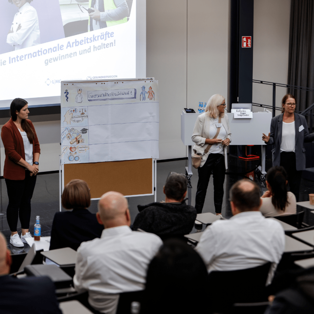 Vertieft wurde dann durch drei branchenspezifische Impulse: Lea Degener und Christoph Mey vom Evangelischen Krankenhaus in Weende referierten zu „Ausländischen Fachpersonen am EKW – Recruiting, Begleitung und Onboarding“. Für den Bereich Logistik hat Andreas Lakemann von der BARMER Bremen über den Fachkräftemangel in der Logistik unter dem Motto „Wenn die Regale leer bleiben“ gesprochen und Katharina Darisse von Fair Job Hotels mit ihrem Vortrag „Armel hoch und los geht´s – DIY Fachkräftegewinnung“ einen Einblick in die Gastronomie gegeben.